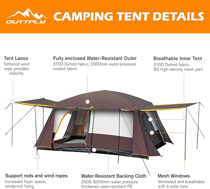 - Accessories and Setup: The whole set includes storage bag*1, outer tent*1, inner tent*1, wind rope*14, steel stake*22, top fiberglass pole*3, corner support pole*4, side support pole*2. Meanwhile, OUTTPLY is equipped with 6 extra foyer poles, sealing seams and full-zippered windows; a full range of accessories to increase the stability of outdoor use, and can be set up quickly.