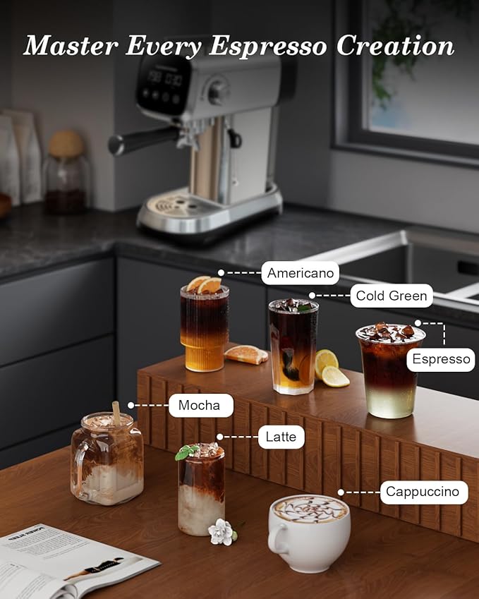 - FIND JOY IN MAKING COFFEE, The expresso coffee machines allows you to prepare all your favorite espresso drinks. You can enjoy a barista-brewed latte, cappuccino or macchiato at home. Stainless steel appearance, stylish and durable, ideal for any small kitchen countertop. A great day begins with your first cup of coffee in the morning