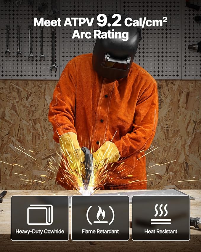 - Heavy-Duty Leather: Our welding jacket is made from heavy-duty full cowhide leather, meeting the ATPV 9.2 Cal/cm² arc rating to protect you from sparks, flames, and fire hazards. The leather material is easy to clean and maintain, ensuring long-lasting durability and reliable protection.
