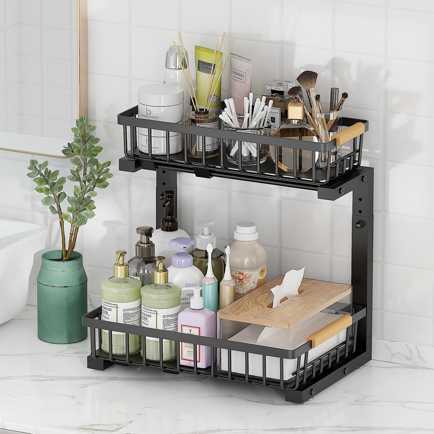 2-Tier Slide Out Under Sink Organizer – 2-Tier Pull-Out Storage Rack, Bathroom organizers and storage for Kitchen and Bathroom, Space-Saving Cabinet Organizer, Rustproof,(Black)(2 Pack)