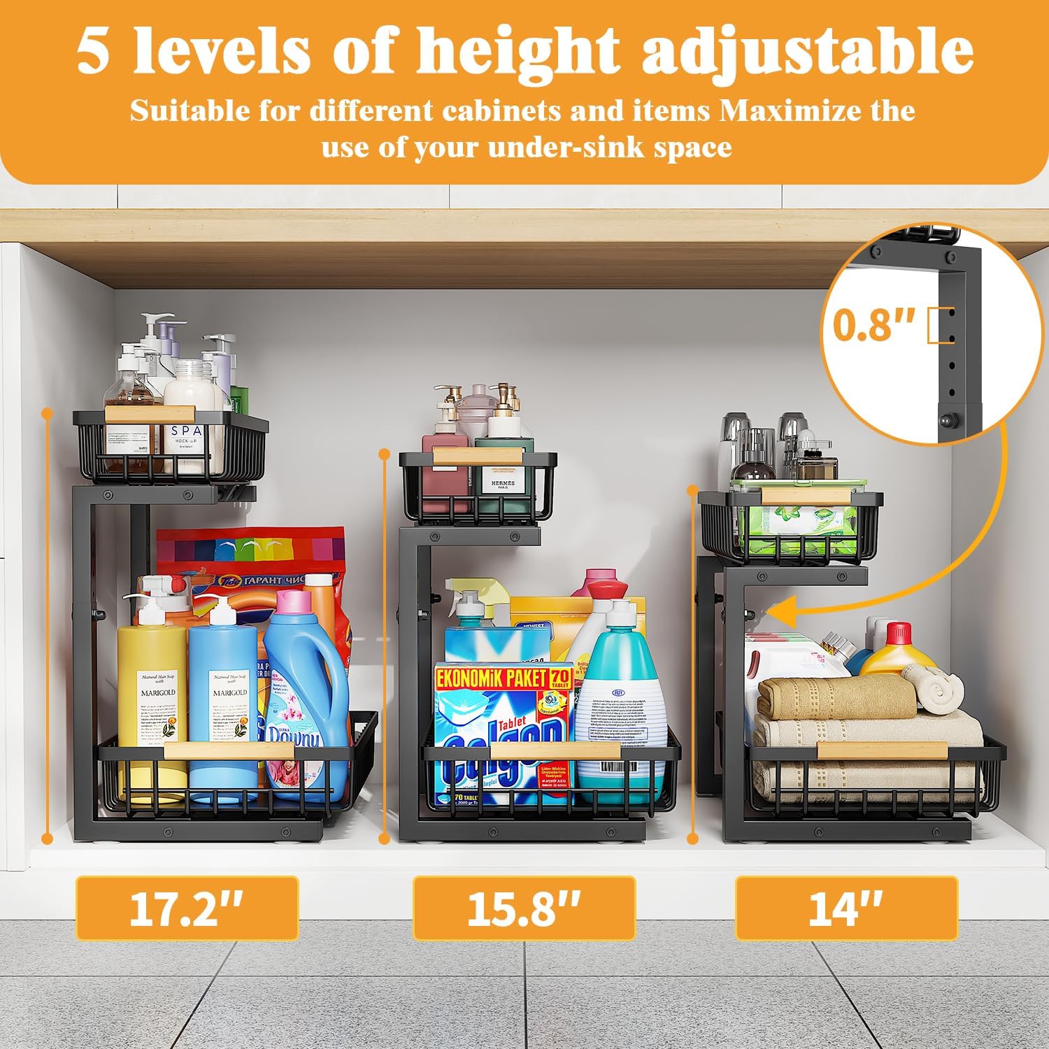 - 2-Tier Pull-Out Storage Baskets: The 2-tier under-sink organizer features smooth sliding rails, ensuring both upper and lower baskets slide out effortlessly without jamming or making noise. The dual-slide functionality makes accessing deep cabinet items easy, especially in deep cabinets.