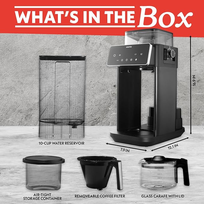 - Integrated Grinder for the Freshest Coffee Experience – The Gourmia 10-Cup Grind & Brew Coffee Maker features a built-in adjustable grinder, grinding beans right before brewing to extract maximum flavor and aroma. Select from coarse to fine grind settings for a customized brew, or use the Grind Off function to brew with pre-ground coffee.