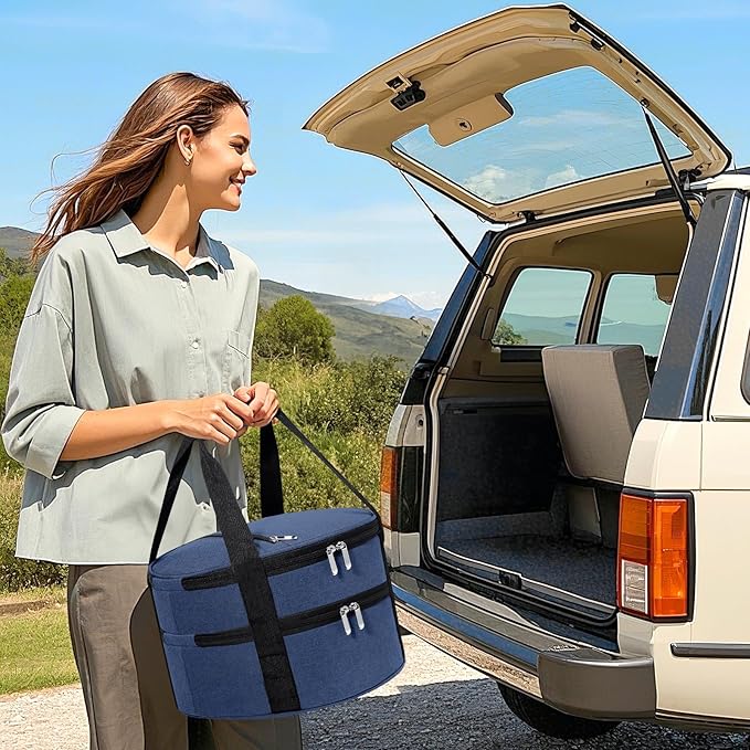 - 【Multi-function】This casserole carriers for hot or cold food is perfect for a wide range of occasions and events. It is very suitable for family gatherings, office gatherings, outdoor picnics, camping, barbecues, and more! Whether you need to transport casseroles, pizza, desserts, or beverages, this round insulated food carrier can meet your needs.You'll love the convenience and versatility of this hot food bag!