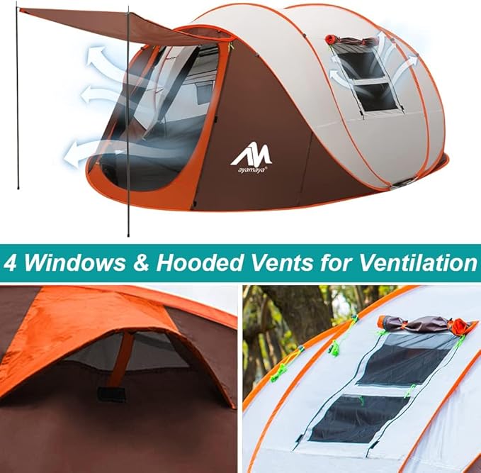 - [ Large Doors + Hooded Vents + 4 Windows - More Ventilation ] β This pop-up tent with large FRONT door and REAR hooded vents, 4 zipper design mesh windows on the left and right sides. Windows & doors with double panels, allows either side to be completely open. Closed with just the mesh material, allows hot air to escape while keeping small items out. Or sealed with the nylon door for total privacy. Both with double-side zipper, enable to zipper in the tent without getting out the tent.