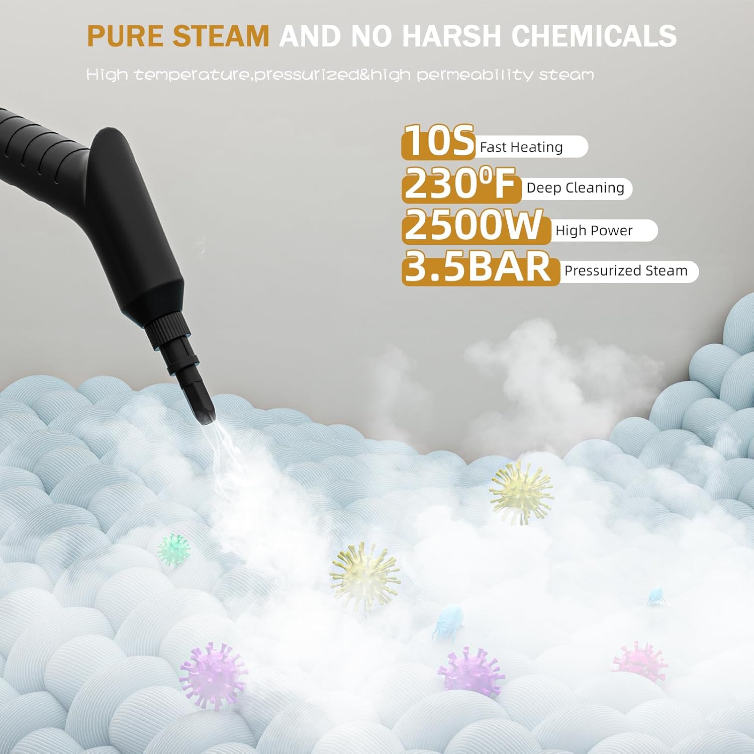 - Powerful High-Temperature Steam Cleaner: Instantly blast away stubborn grease,grime and stains with 2500W steam power reaching 221°F (105°C) in 10 seconds!Our handheld steam cleaner delivers 3.5 bar of high-pressure steam for deep cleaning of stoves,cookers,tiles,grout,sofas,upholstery,carpets and car.