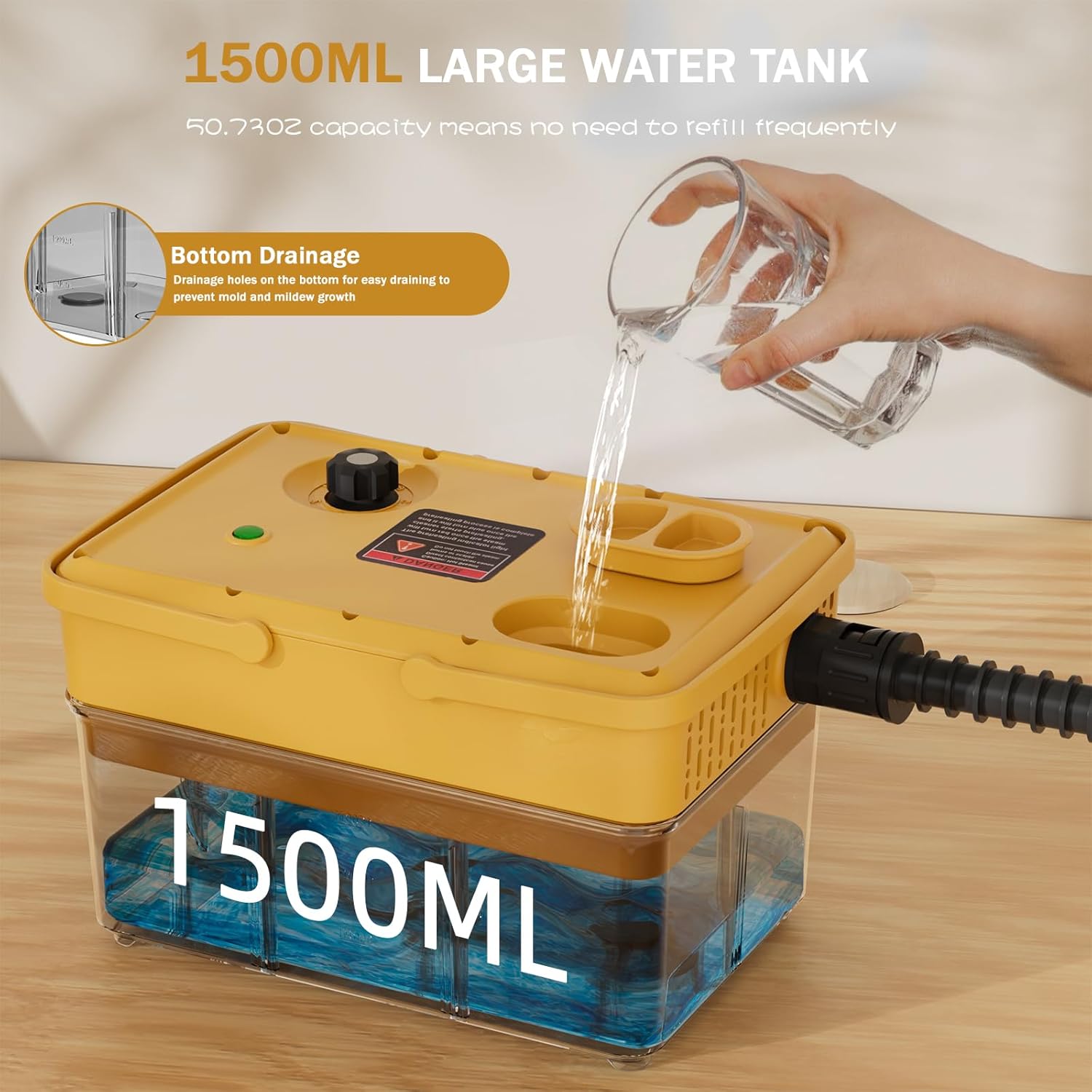 - 50.73OZ Large Tank & Continuous Cleaning: Enjoy 25~60 minutes of non-stop cleaning with the 50.73OZ (1500ML) water tank—no frequent refills!The top design allows you to refill the tank at any time,and the bottom drain allows you to drain the remaining water when you are done cleaning.The water tank is made of translucent,high-strength material that allows the user to monitor the water level easily.