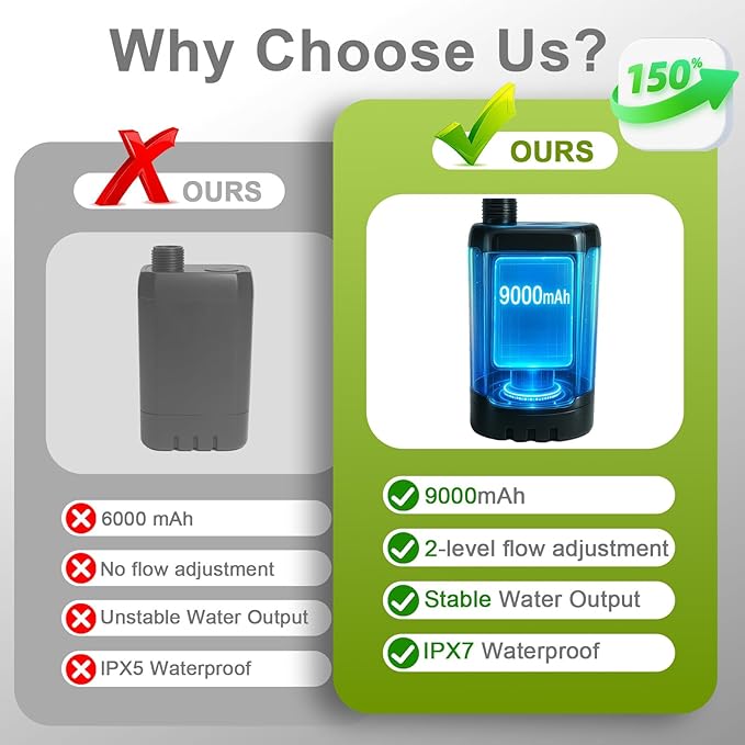 - Ultra-Long Battery Life: Our camping shower pump is equipped with an upgraded 9000mAh ultra-long battery capacity, which can work continuously for 180-200 minutes. In addition, its Type C interface is convenient for charging with mobile devices, such as mobile phone chargers (5V 0.5-2A), mobile power supplies, laptops or car USB output charging. The interface is equipped with a silicone waterproof cover to ensure safe use. Note:【No heating function】