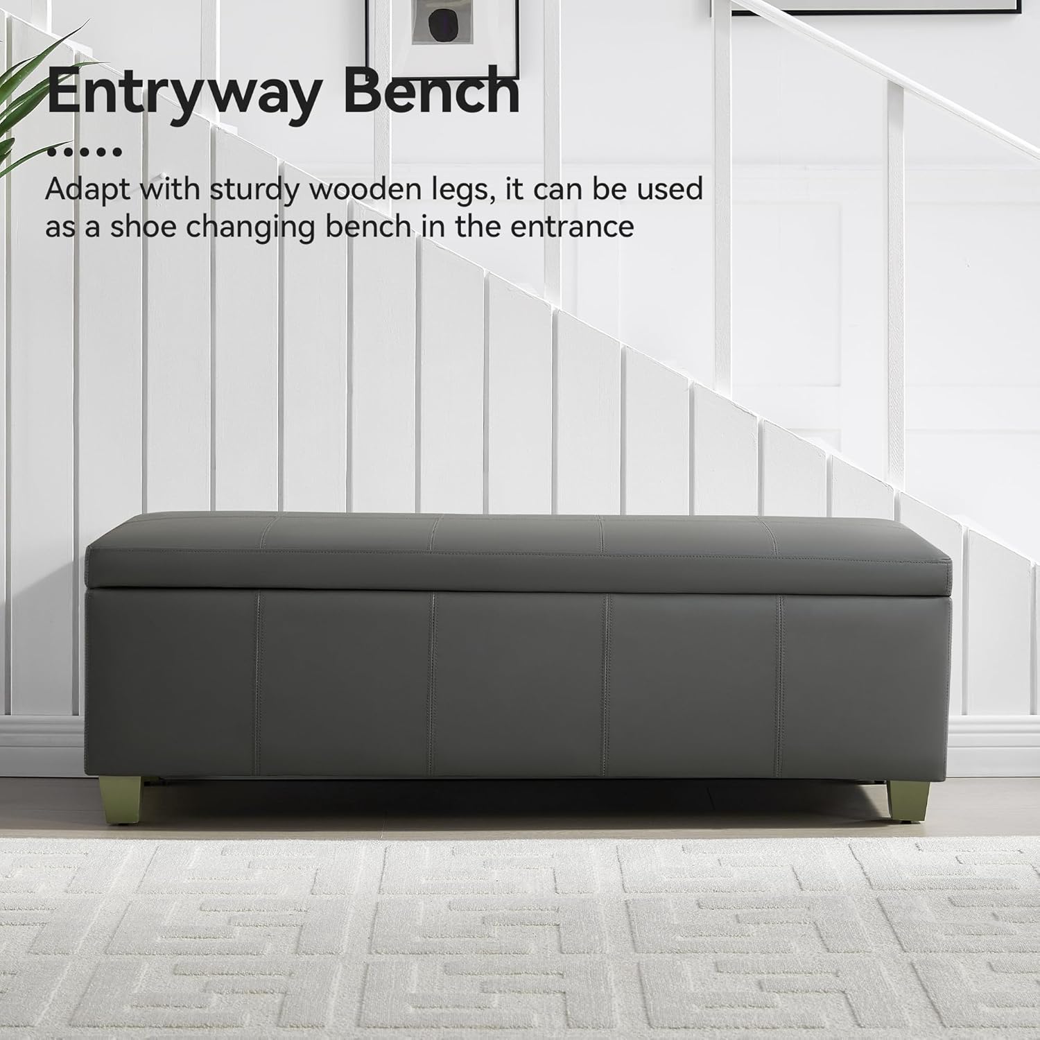51" Faux Leather Storage Ottoman, Stitch Tufted Rectangle Upholstered End of Bed Storage Bench, Entryway Large Couch Ottoman with Wooden Legs,Dark Grey