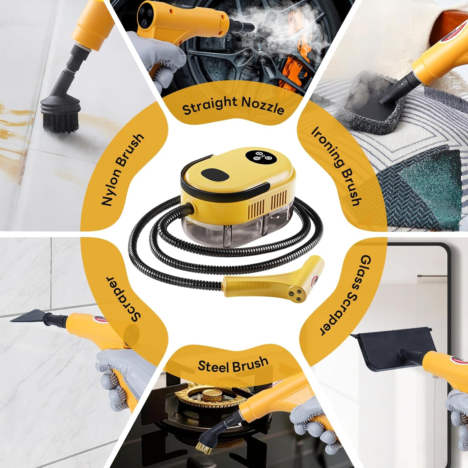 - Chemical-free Cleaning Steam: Most important advantage of the Handheld Steam Cleaner - Steam Cleaner only heated water to break down and remove stubborn dirt, dust, and grease, cleaning countless household surfaces without the use of chemicals. Steam Cleaner with a superpower of 1500 watts, Steam Cleaner generates a temperature of up to 221β (105β) in just 10 seconds, without harmful smoke or residues, especially friendly to pets and children.