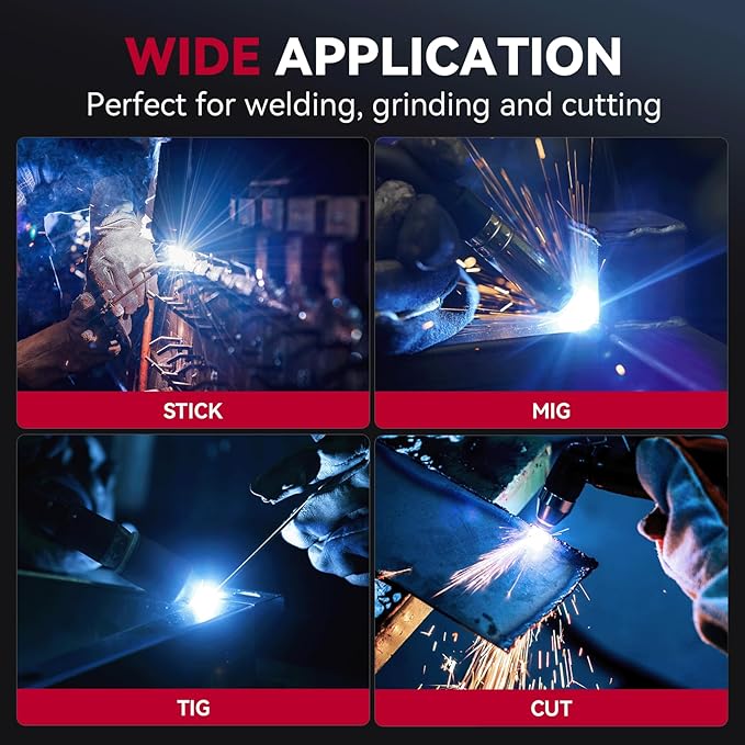 - FASTER AUTO DARKENING: Upgrade to high-end auto-darkening lenses with 4 premium arc sensors, switching from light to dark in 1/25000 sec. Easily adjust the shade and sensitivity of the lenses for different working environments, perfect for STICK/MIG/TIG welding, grinding, and cutting. Dark state level: 4/5-8/9-13.