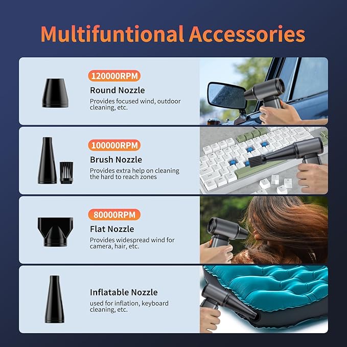 - 【6 in 1 Multifunctional Accessories】Our product kit arrives with 3 different nozzles, a nozzle connecting brush, a Type-C charging cable, and a lanyard ensuring secure grip during single-handed tasks like BBQ ignition, tent inflation, or pet drying. All component stores compactly for grab-and-go portability to prepares you for different scenarios and all the hard-to-reach zones