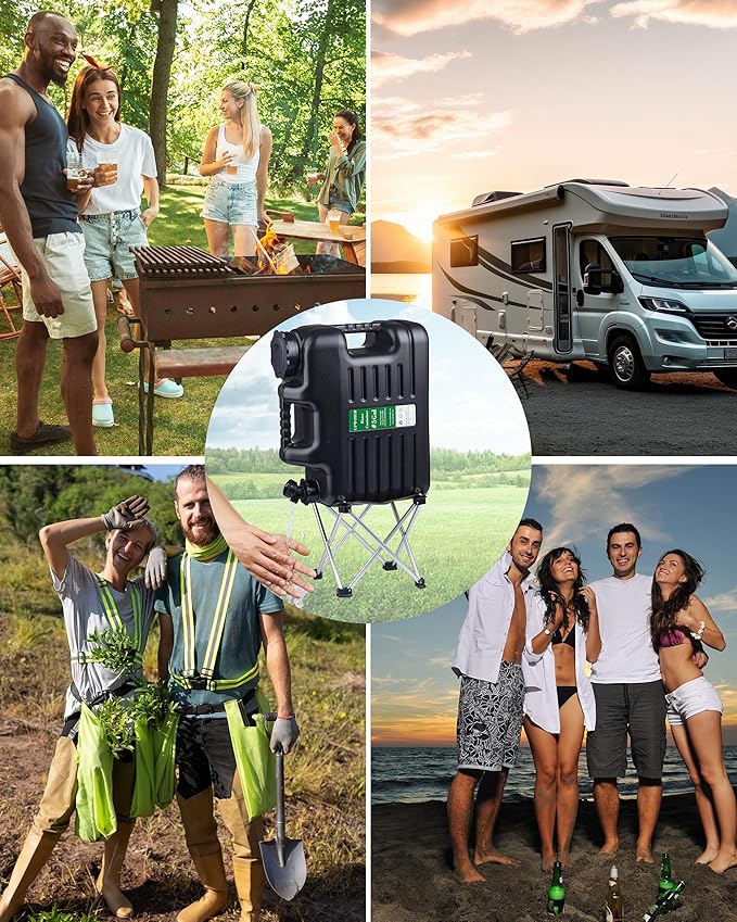 - Portable and Easy to Store:Designed for convenience, the jug features a strong built-in handle for easy carrying. Both the water container and folding stand are collapsible, allowing for compact storage and effortless transport—perfect for car trunks, RVs, and camping gear.