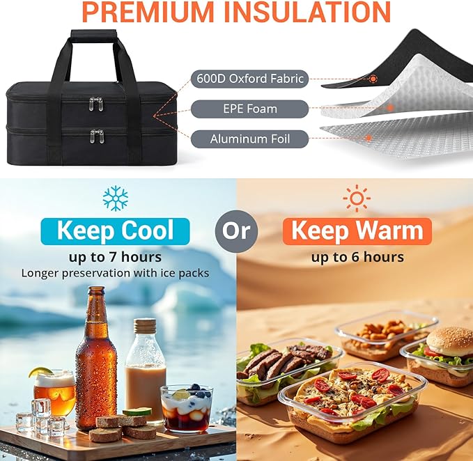 - 【Multi-Purpose and Travel-Ready】With its lightweight design and large capacity, this insulated bag is perfect for transport to potluck parties, BBQs, tailgates, and cookouts. Use it as an insulated cooler for cold desserts or a thermal bag for warm dishes—it’s built for any occasion.