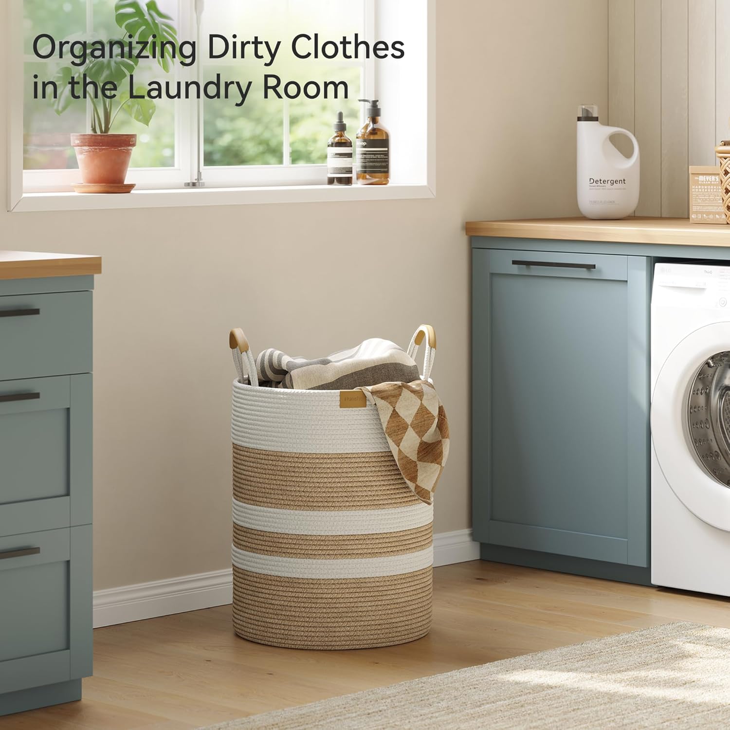 62L Striped Laundry Hamper with Leather Handles,Large Foldable Laundry Basket for Clothes,Cotton Rope Storage Bin for Blankets,Woven Clothes Basket for Bedroom, Beige Stripes