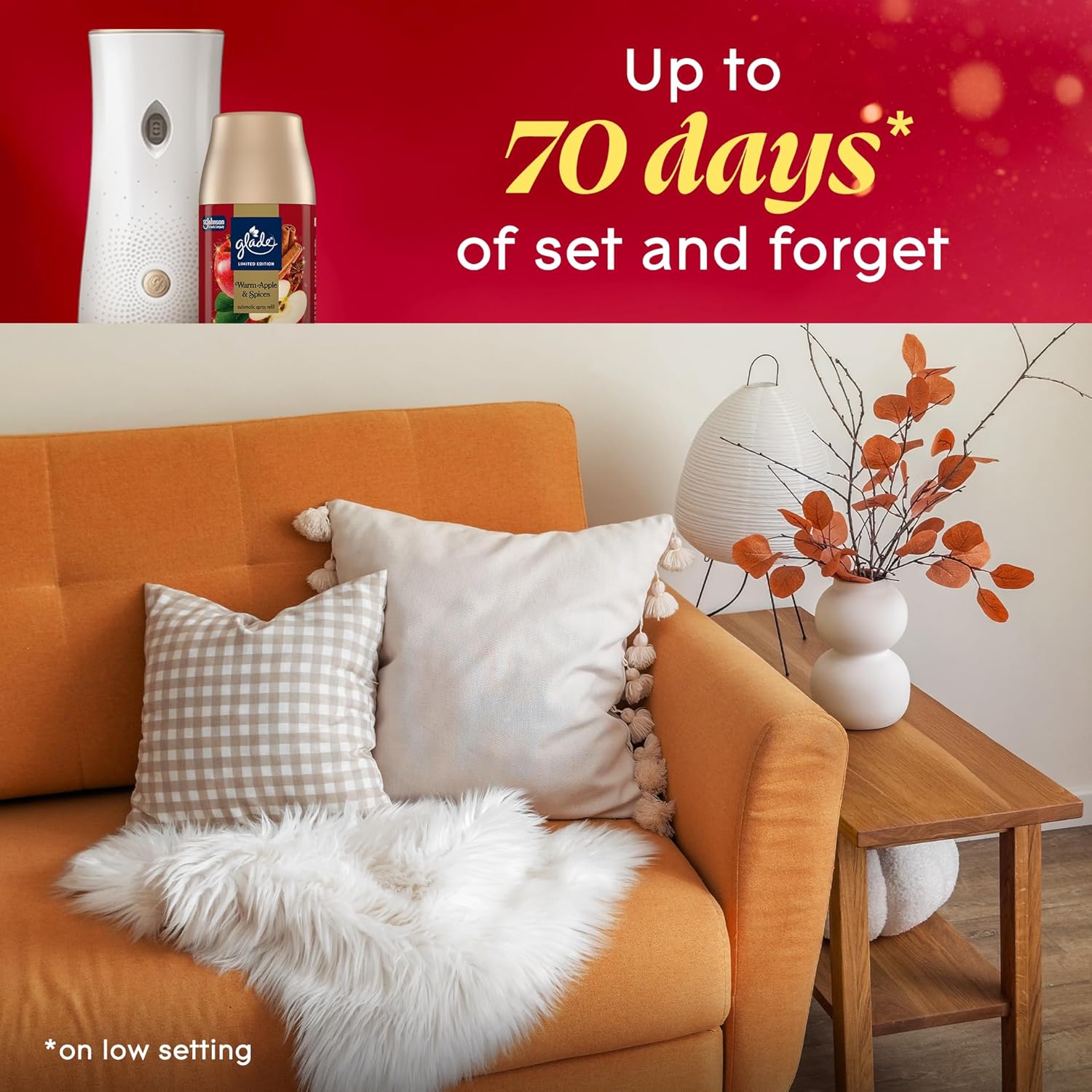 - Includes 2 automatic spray air freshener refills in the Warm Apple & Spices fragrance