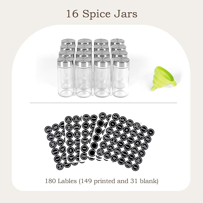 - 【All-Inclusive Set】Includes 16 airtight glass jars, funnel, 180 lables(149 printed and 31 blank), functional kitchen spice organizer.