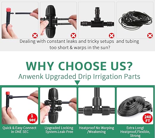 - 【Fast Setup, Big Results】-Transform your garden with this complete, water-efficient drip irrigation system. With 2025 push-to-connect leak-proof fittings, UV-resistant tubing, and customizable sprayers, your plants get consistent moisture with minimal waste—perfect for gardens, greenhouses, balconies, rooftops, and cooling fog systems.