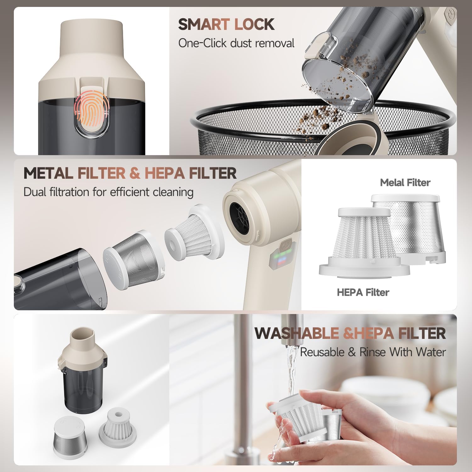 - 【Dual Filtration System & one-click to Empty】Car vacuum portable cordless cleaner comes with an upgraded dual filtration system. The HEPA filter fine dust during use and can be easily washed and reused. Metal filters effectively filter out large particles of debris to prevent damage to the cordless handheld vacuum. One-click dust removal design, just one click, the garbage can be emptied smoothly without dirty hands.