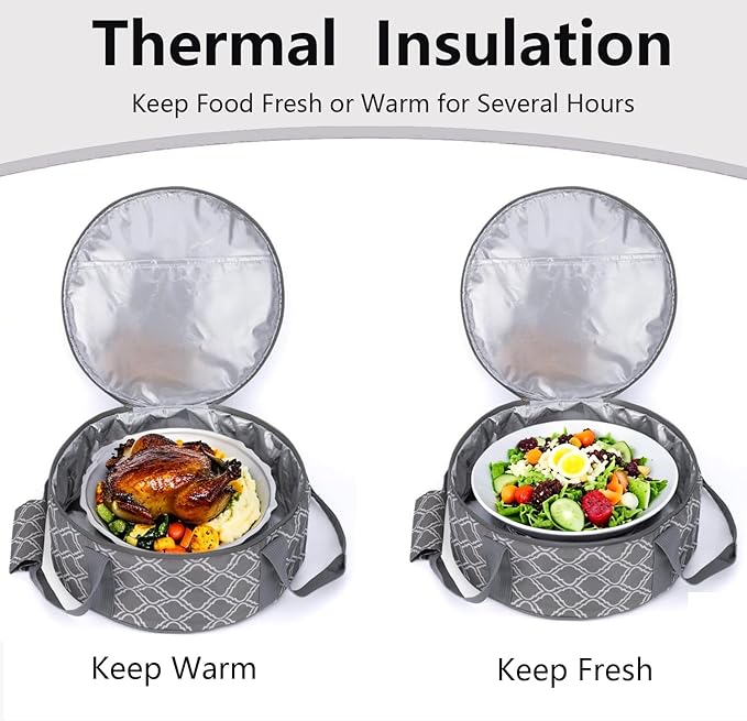 Round Portable Insulated Thermal Dish Carrier Bag for Pie and Cake Transport to Keep Food Hot/Cold/Fresh for Lunch, Potlucks Parties Gathering,Cookouts,Church Dinner,Outdoor Events-Sliver Grey