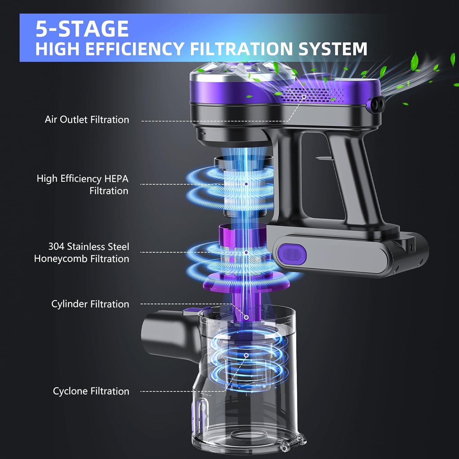 - EFFICIENT FILTRATION SYSTEM: This cordless vacuum cleaner is equipped with a 5-stage advanced filtration system, which can efficiently absorb 99.99% of dust particles to ensure cleaner air at home. The large-capacity dust cup meets a variety of cleaning needs, and the one-button emptying dust cup design avoids contact with dust and makes cleaning more hygienic.