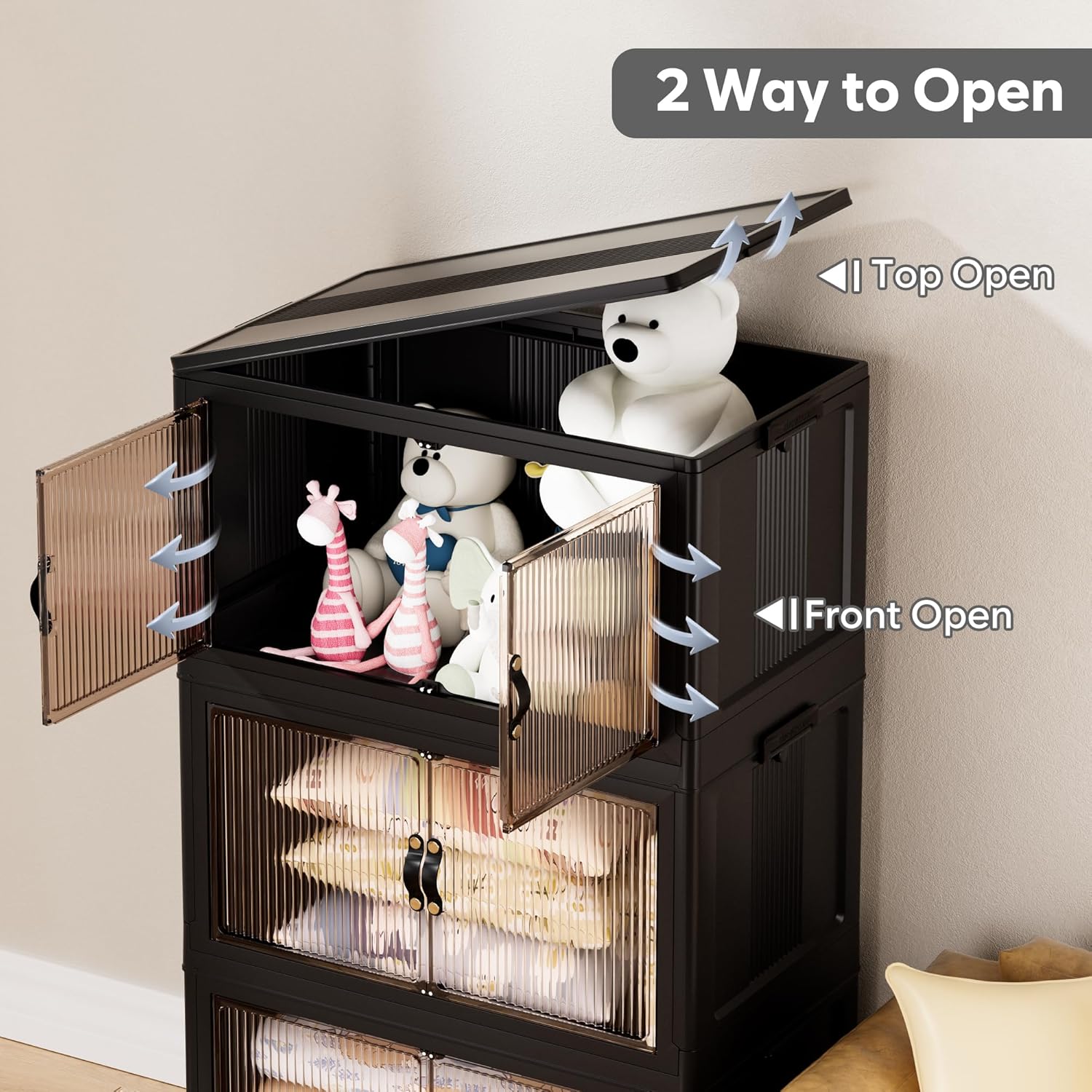 - 【Two Way Open】The bins feature front double doors or top lid openings. The magnetic lock provides easy access to the front, while the top lid allows for easy access to larger items like clothes and blankets. These bins are perfect for storage bins with drawers to enhance organization and storage.