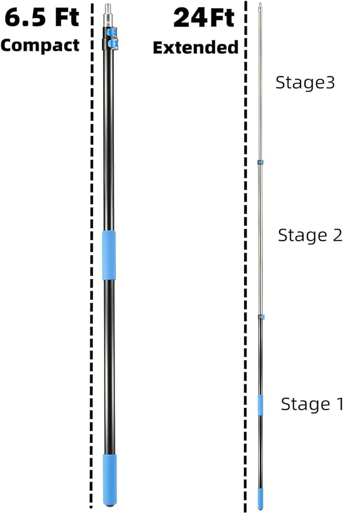 - Comes with a telescopic pole which is made of lightweight sturdy aluminum and features easy flip-tab lock mechanism for adjusting to any custon length from 6 to 24ft.
