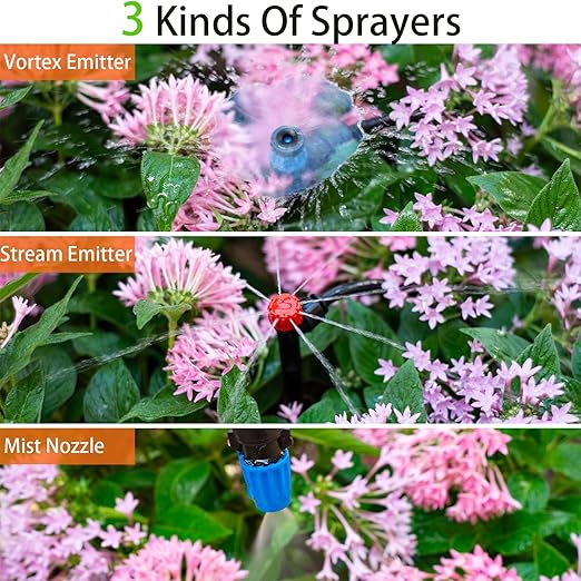 - 3 Kinds of Adjustable Drip Emitters: high quality irrigation drip emitters (vortex, drip irrigation, mist )included in this automatic watering system, forget about clogged drip heads.Rotating covers to adjust the water flow size of nozzles to meet the watering needs of plants in different locations and fulfilling your entire irrigation demand.NO more dragging the irrigation hose around or worrying about missing a spot.