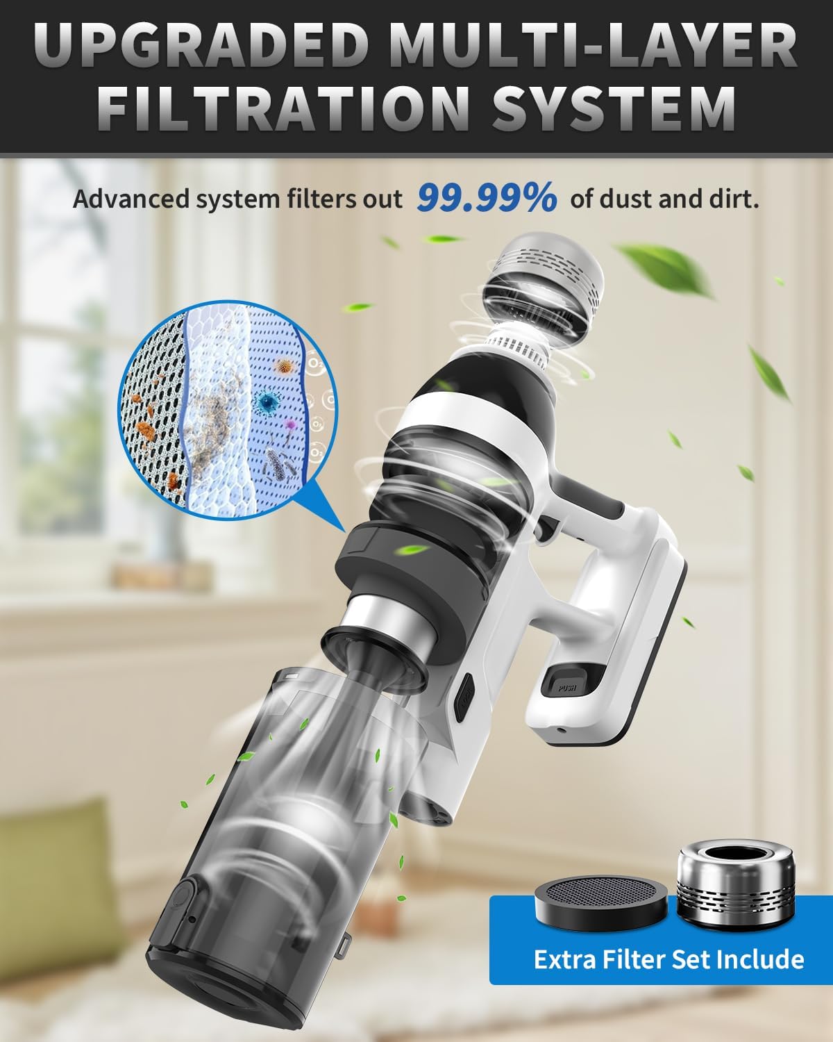 - ★ [Large capacity & efficient filtration] Includes an extra set of spare HEPA filters, The household vacuum cleaner adopts an 8-layer precision filtration system with a filtration accuracy of up to 99.99%, which can capture tiny dust particles with a diameter of 0.1 microns, ensuring a cleaner home and fresher air. The 1.5L large-capacity dust cup can Load more junk. You can empty the garbage with one hand and one click, achieving efficient dust removal.