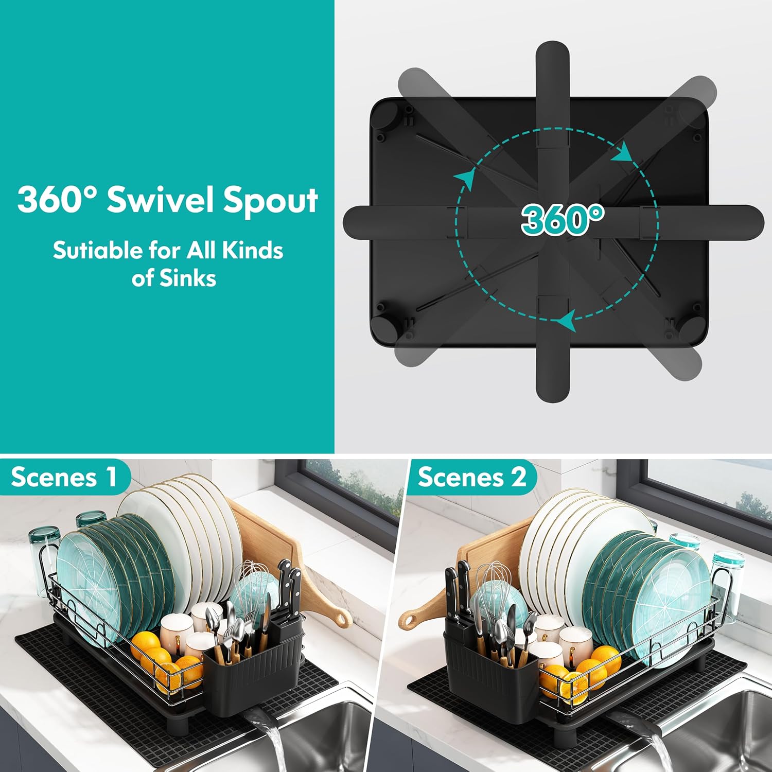 - Efficient Drain: Includes dish rack with drain tray, guided channels + extended and rotated spout route water smoothly to sink to prevent leftover drips on counter