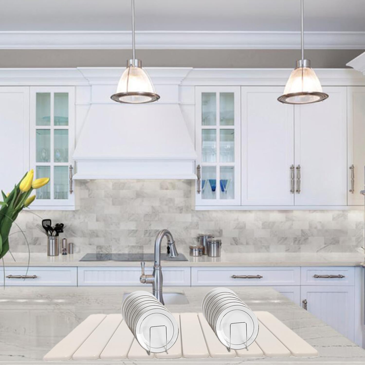 - Super Absorbent, Fast Drying:The stone dish drying mats for kitchen counter is made of natural diatomaceous earth with super absorbent ability, which can quickly absorb water in minutes to stay away from moisture problems, so that your kitchen countertop or bathroom surfaces are always dry.
