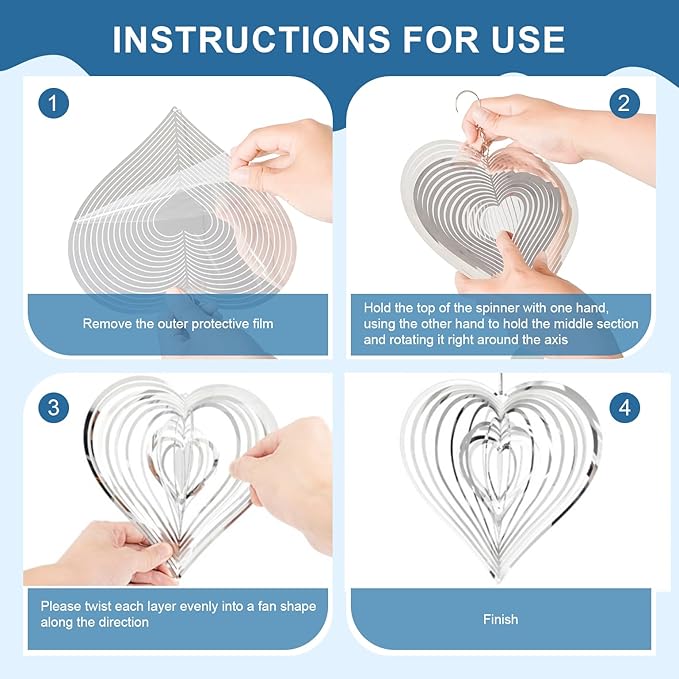 - 【Hanging and Sturdy 360° Rotating Hooks】It is for outside and indoor and easy to assemble. You just need to twist it to your favorite angle as shown in the picture and it can be hung immediately. Our metal wind spinners outdoor can be hung on indoor or outside like as corners of your deck, lamps, high trees, walls, balconies, verandah and windows. It have instruction about bending the wind spinner to make the 3D rotational heart