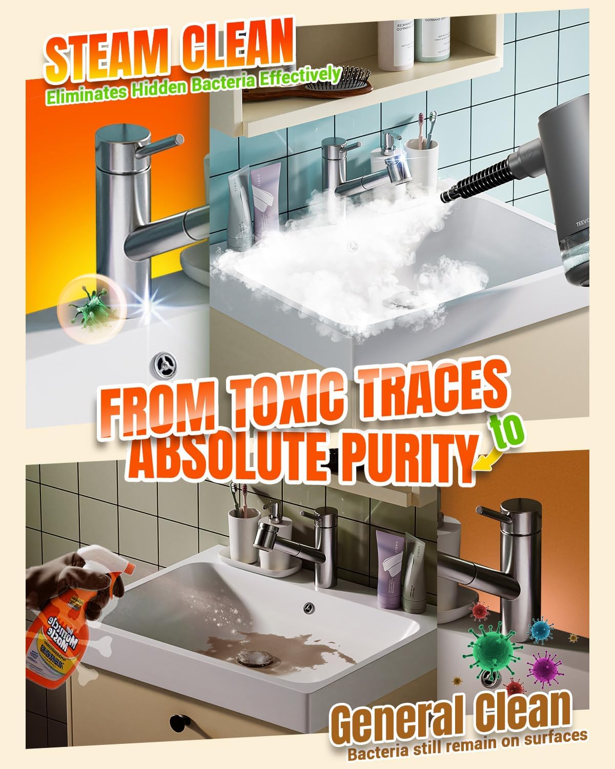 - Impressive Results: The TEEVOGO hand held steam cleaner makes it easy to remove built-up gunk from bathroom grout, kitchen corners, and other tight spots. This handheld steam cleaner for home restores original shine to hard surfaces, delivering that satisfying “wow” moment every single time