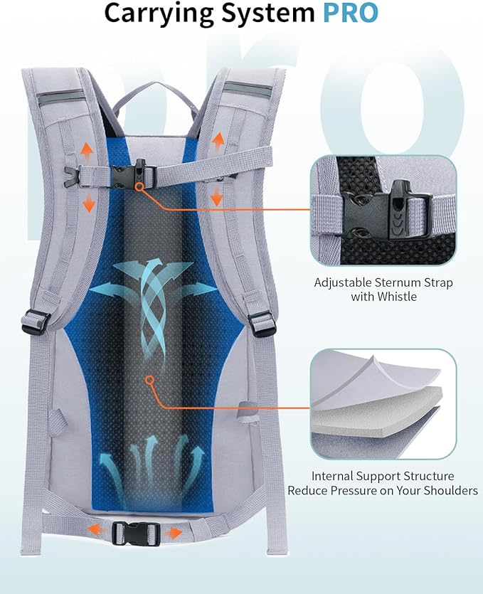- 【Unique Details Design】 Adjustable sternum strap with safety whistle design. Reflective trim and rubber band rope design for enhanced safety during nighttime travels. Stabilization system consisting of adjustable sternum strap and waist straps keeps the pack stable and comfortable during hikes. The sides of the backpack have elastic and fasteners that can store trekking pole. Hook mechanism on the front pocket for attaching various items.