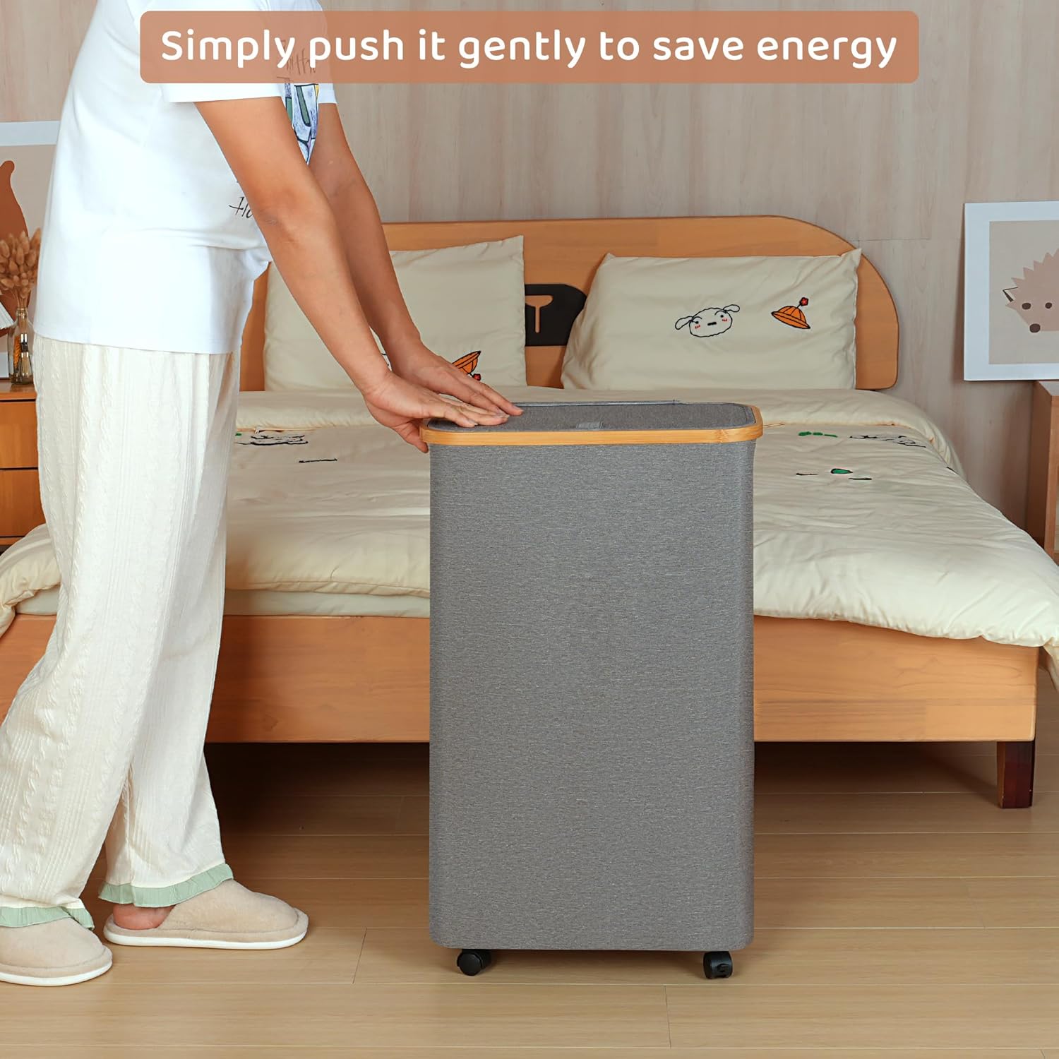 Slim Laundry Basket with Wheels,Narrow Hampers for Laundry, Laundry Hamper with Lid&Bamboo Handles,Dirty Clothes Hamper for for Bathroom Bedroom Dorm, 60L Grey
