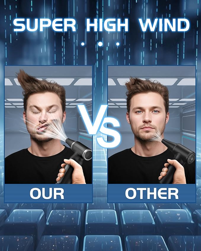 - Turbo fan【Super High-Speed motor 330000 RPM】--This air duster the maximum speed of【 300000 RPM】,【200 G】 wind pressure, delivering strong performance with a peak wind speed exceeding【 120m/s】,mini blower easily clear the dirt hidden in various gaps on the keyboard or any electronic devices,electric duster strong wind and high performance.