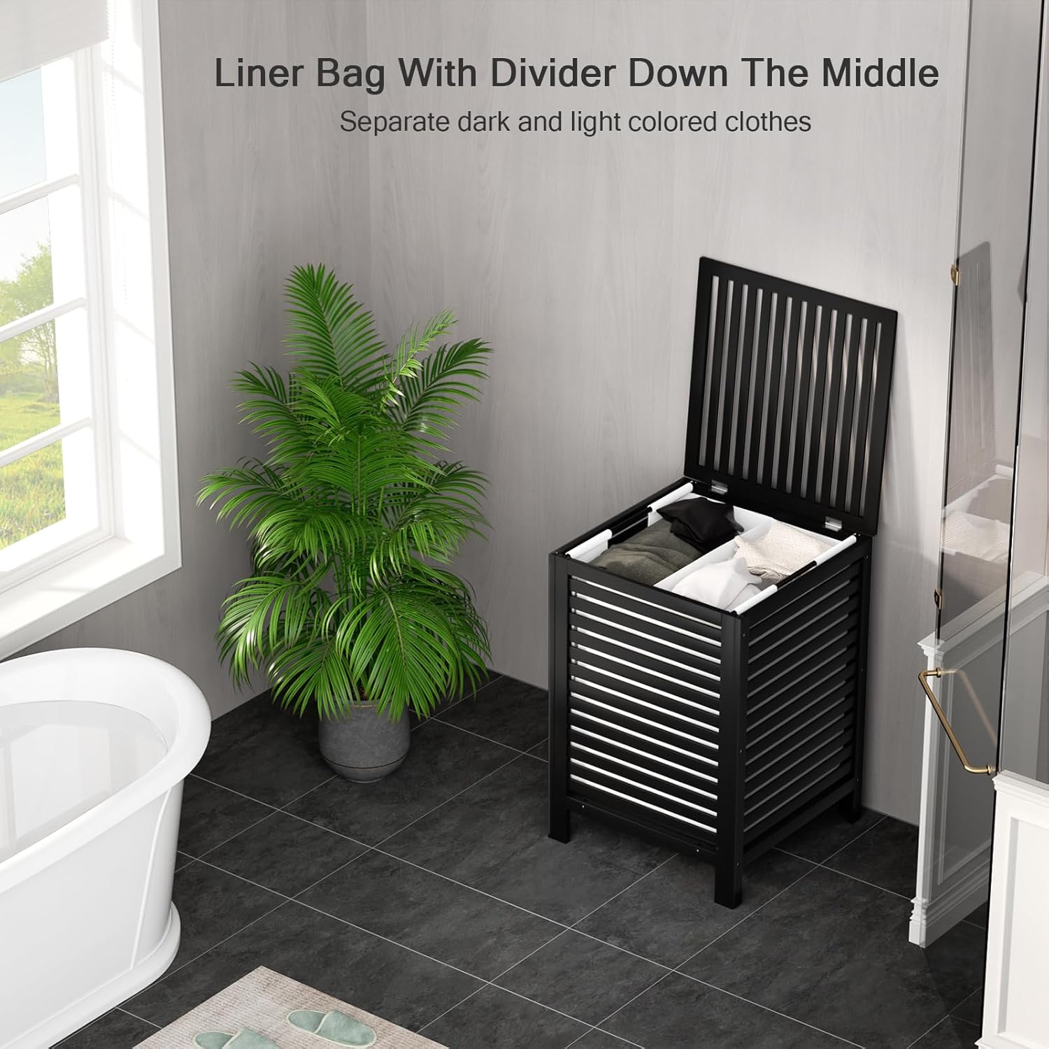 Homykic Bamboo Laundry Hamper with Lid, 120L Large Clothes Laundry Sorter with Removable 2-Section Liner Bag, Raised Laundry Basket Organizer for Clothing, Bathroom, Bedroom, Laundry Room, Black