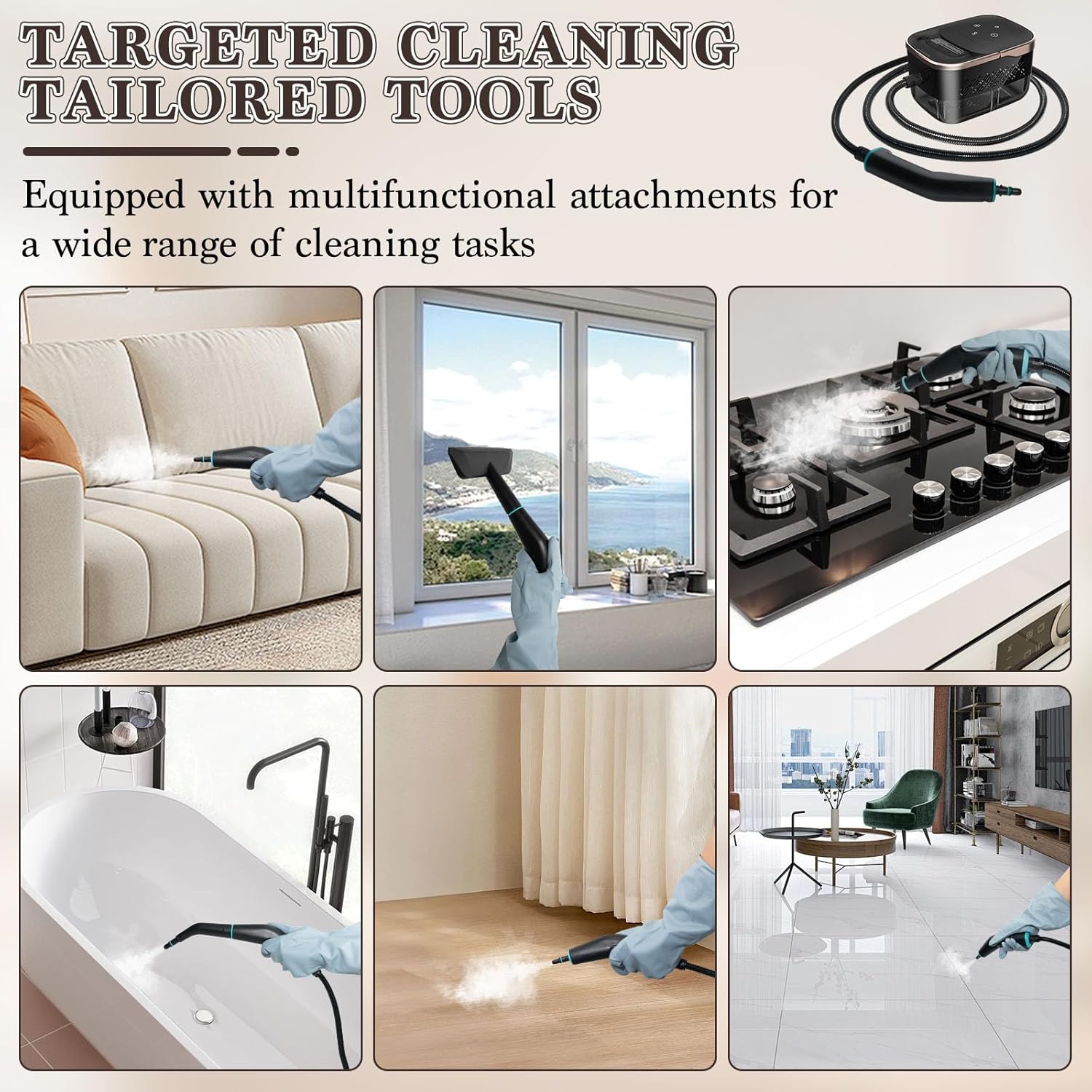 - Multipurpose Steam Cleaner:The portable steamer for cleaning comes with a 118 - inch power cord and a 78 - inch steam hose. It's compact in size (9.53 * 6.1 * 5.12 inches), which makes it very flexible for cleaning. Our steam cleaner handheld is suitable for cleaning all surfaces,including stoves,windows,furniture,walls,microwaves,washing machines,refrigerators,kitchens,living rooms,grills, bathrooms,upholstery,floors,cars,sofas,and clothes.