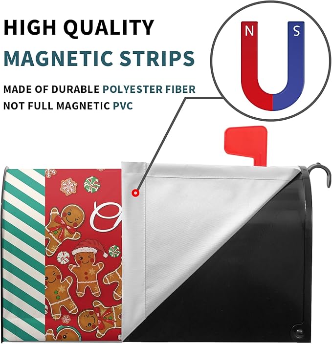 - Standard Size: Designed to fit standard mailboxes, this christma gingerbread man cover measures 21x18 inches. The magnetic backing ensures a secure and easy installation, making it a perfect fit for most mailboxes without any hassle.