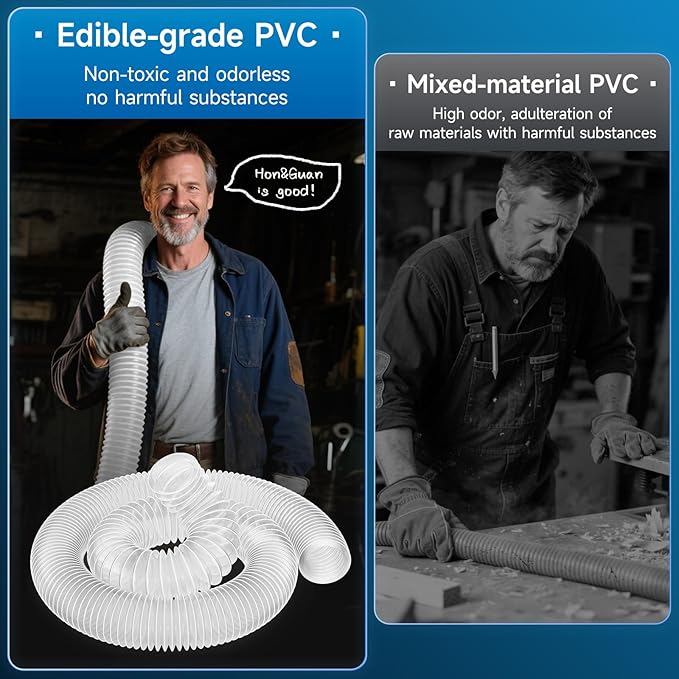 - Premium PVC: Hon&Guan dust collection hose uses edible-grade PVC, harmless, odorless. Strong puncture resistance withstands dust/debris. Transparent design allows checking internal debris for timely cleaning, preventing clogs and boosting safety