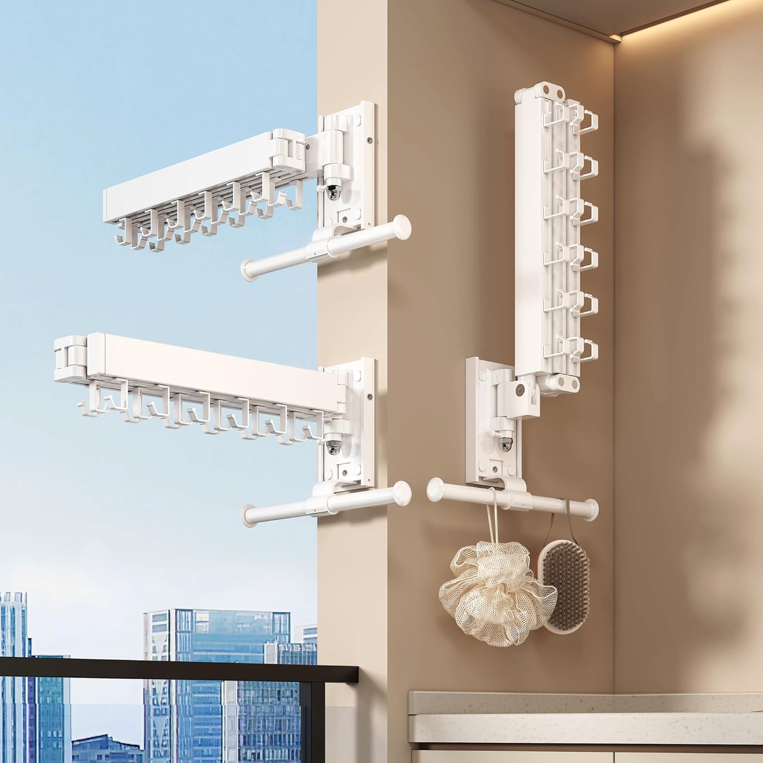 - Wall Mounted Collapsible Design β Space-Saving Drying Solution: This upgraded wall mounted clothes drying rack folds left, right, and even upward, maximizing your space. Perfect for balconies, laundry rooms, or small apartments where every inch counts.