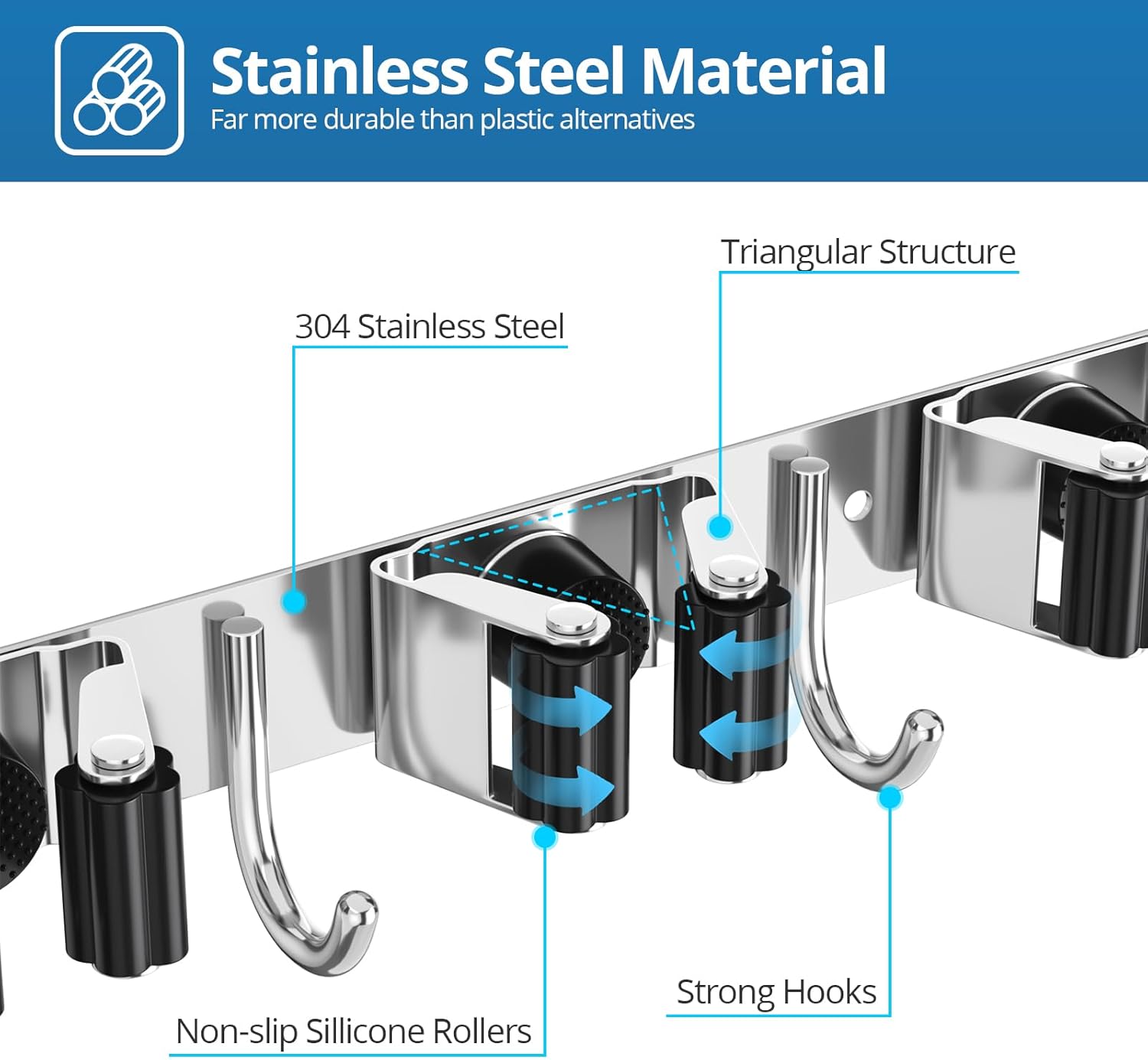 - STURDY & NON-SLIP DESIGN: Made of rustproof 304 stainless steel, this broom and mop holder is far more durable than plastic alternatives. Features anti-skid silicone and double rubber-gripped slots to securely hold tools up to 30 lbs (with screws) or 8 lbs (with self-adhesive), preventing scratches and slips. Ideal for brooms, mops, garden tools, and more.