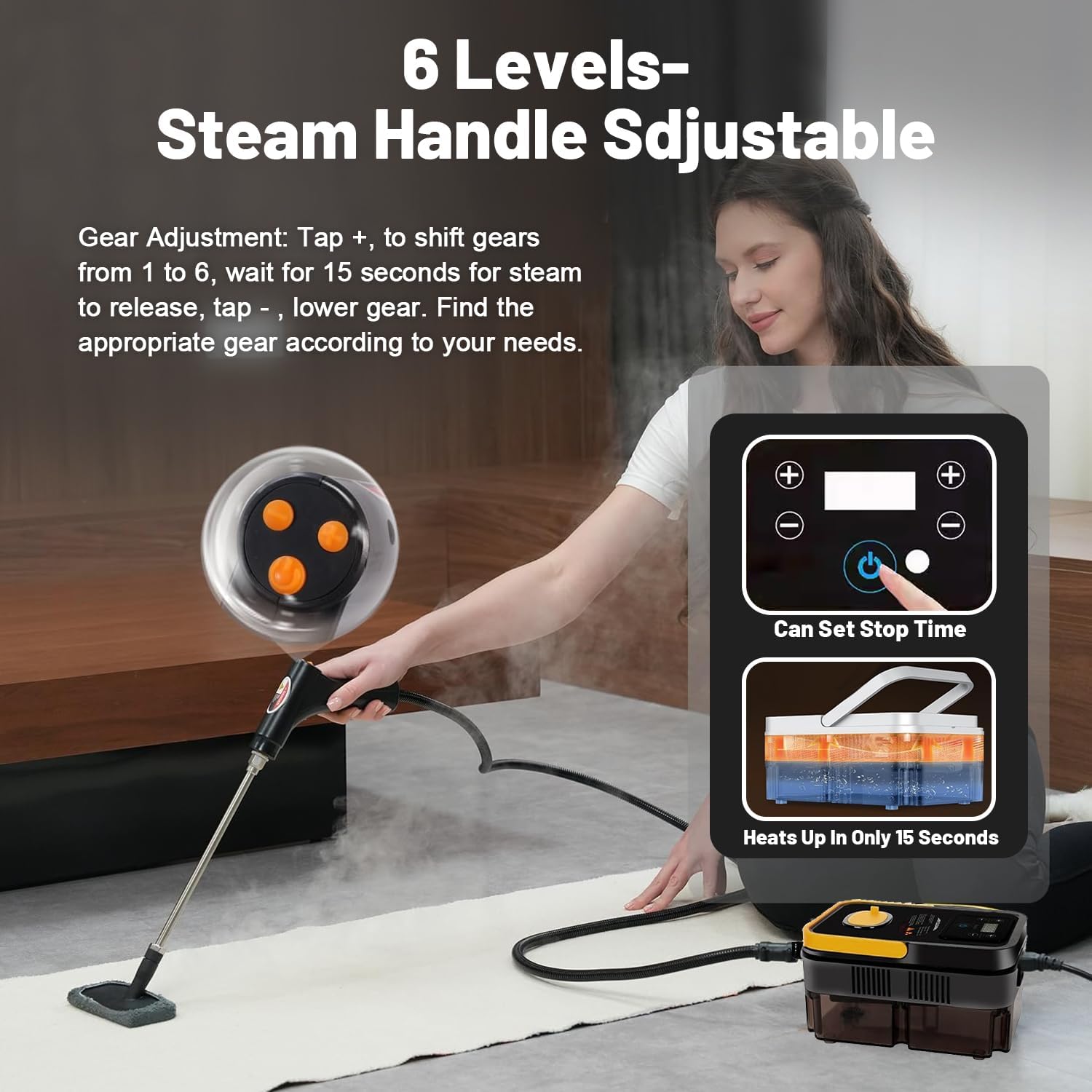 - High Material Steam Cleaner: Steam Cleaners is made from high-quality ABS material, ensuring excellent durability and heat resistance. Steam cleaner for home small and compact, but they can carry a large capacity of 1200ML of water. 2500W strong power handheld steam cleaner can generate 229°F/105°C high temperature and pressure steam within 15s, effectively remove stubborn greasy dirt and stains.