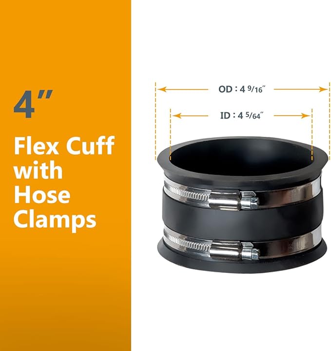 - Flex cuff's dimensions: 4” nominal OD end measures 4-9/16” OD, 4” ID and 2-9/16" Length