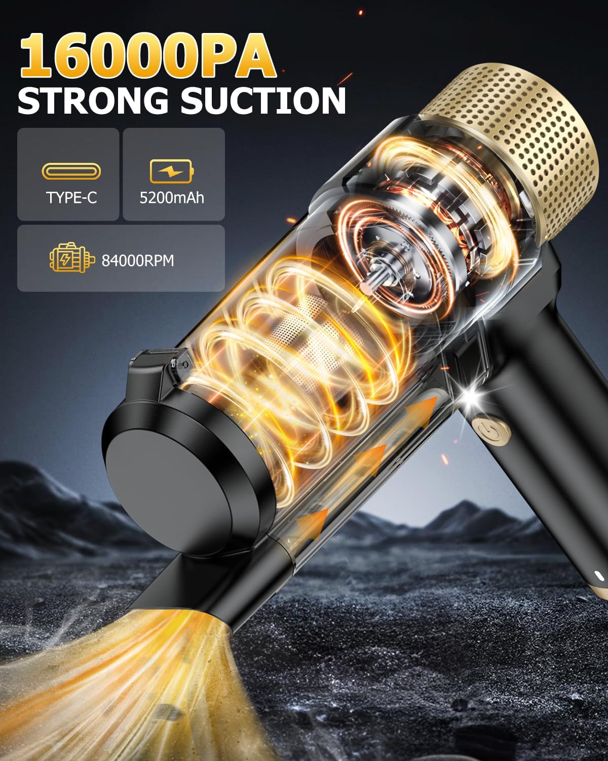 - 🌀【16000PA Suction Power】This car vacuum portable cordless features a strong suction power of 16,000 PA and a motor speed of 84,000 rpm, making it quick and easy to remove hard-to-tackle pet hair, fine debris, and other common dirt. Designed to meet your diverse cleaning needs, it efficiently handles various challenges whether at home, in the office, or in the car, taking the hassle out of tidying up