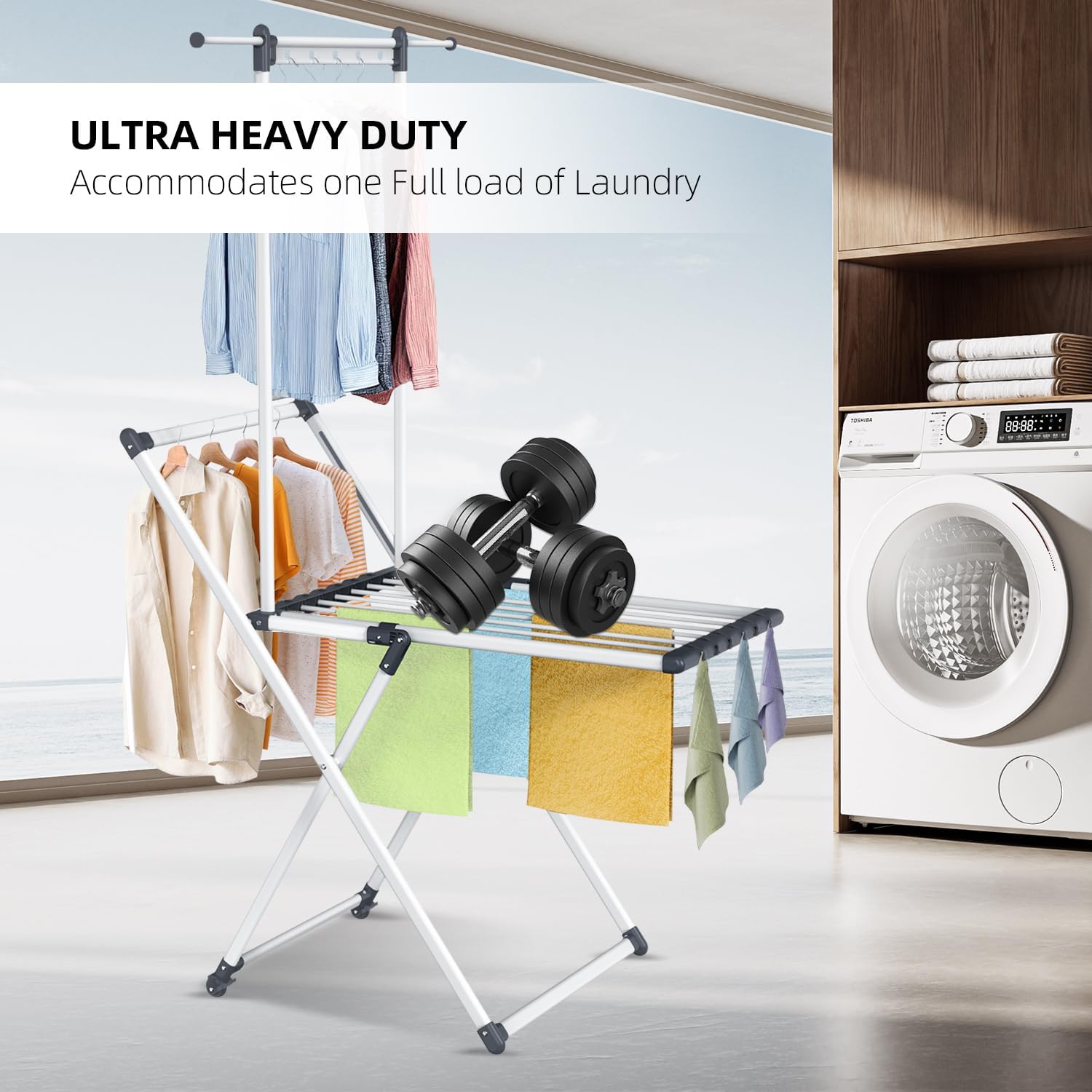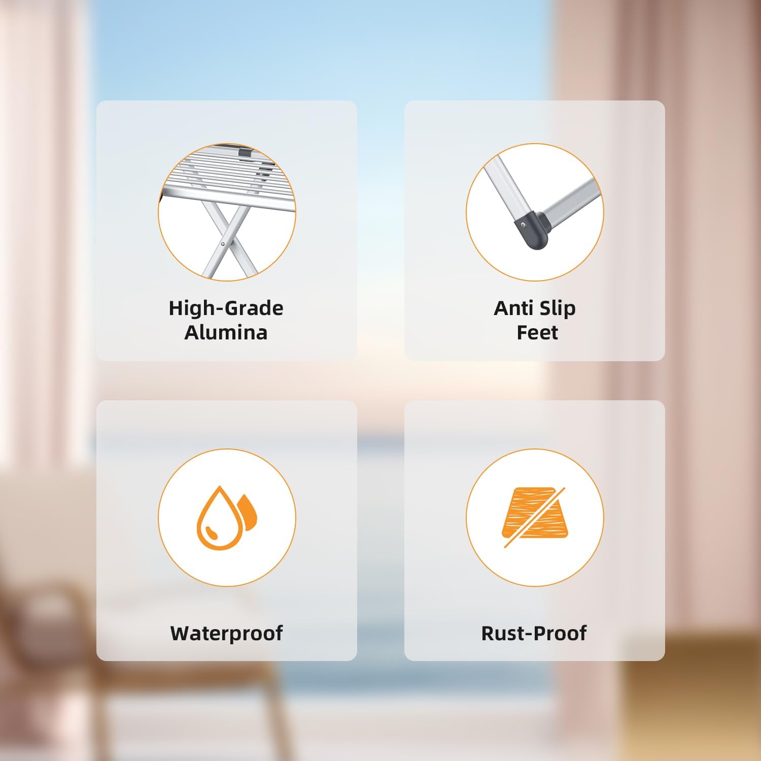 - Maximum Capacity and Stability: Featuring reinforced joints and triangle stability, this laundry drying rack ensures unmatched sturdiness while handling up to 60 lbs of laundry with ease. Designed with a durable aluminium frame for long-lasting use & Non-slip feet to provides stability.