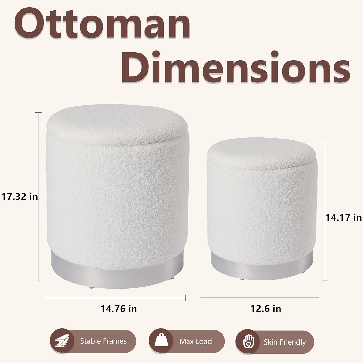 Royal Windsor Boucle Round Ottoman with Storage Set of 2, Vanity Stool with Storage for Bedroom, Ottoman Coffee Table Silver-Tone Ring Around The Base, Small Foot Stool for Living Room, White