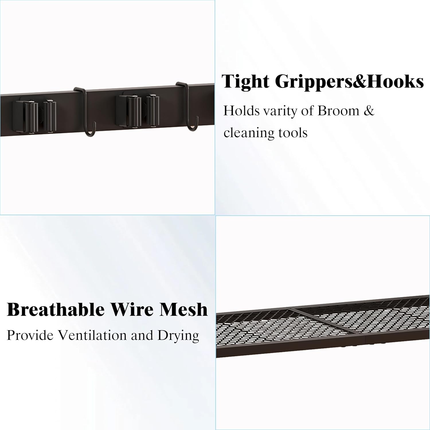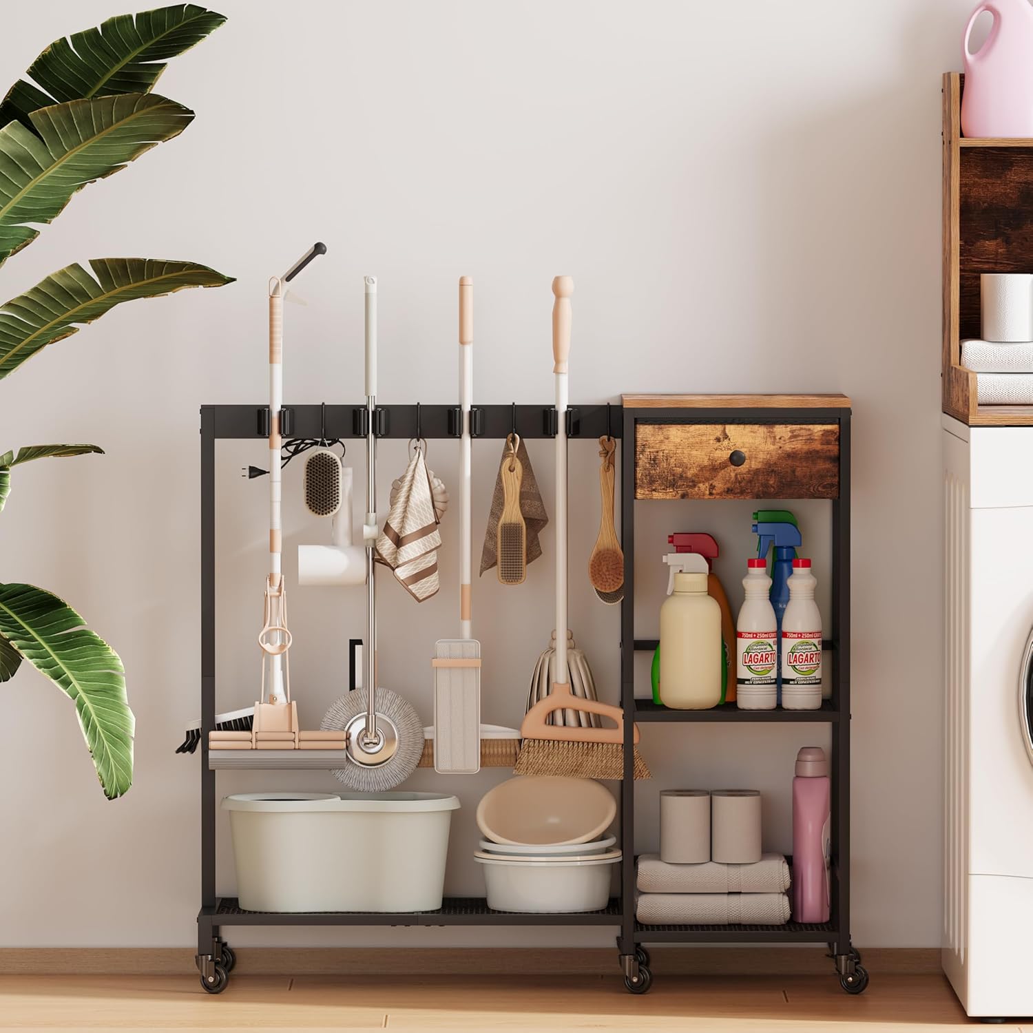 - 【Large Capacity】Featuring 8 grippers, 4 double-sided hooks, 1 fabric drawer and 3 Tier shelves.The broom and mop holder on the cart can securely hold your brooms, mops, and other cleaning tools. The shelves and drawer allows for convenient categorization and storage of all your cleaning supplies. The broom storage organizer provides ample space for organizing a variety of cleaning stuff and accessories