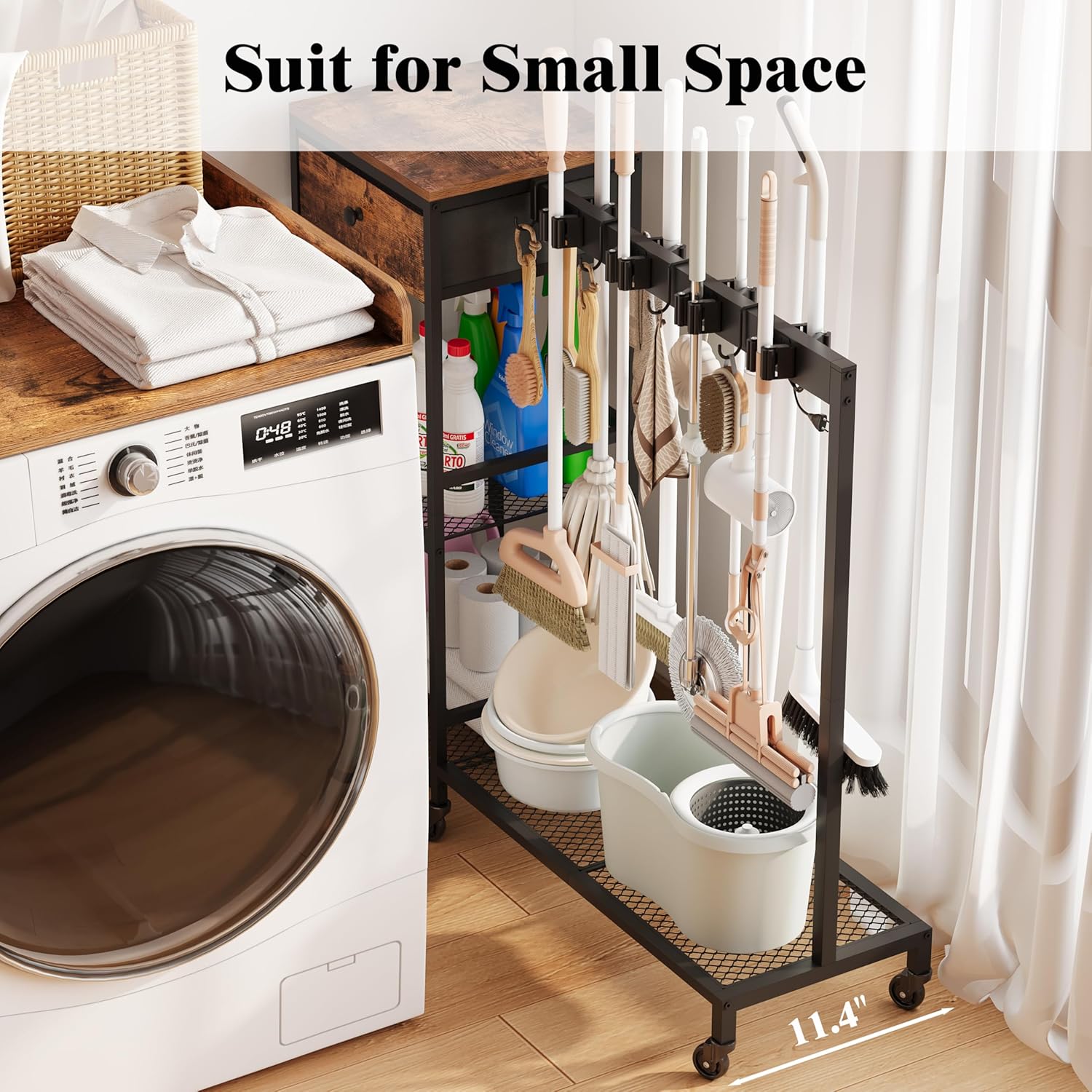 - 【Sturdy and Great Design】The Broom Closet Storage Cart is built with premium particle board and heavy duty iron frame which supports for durability. Coated with a rust-resistant finish, ensuring it stays rust-free