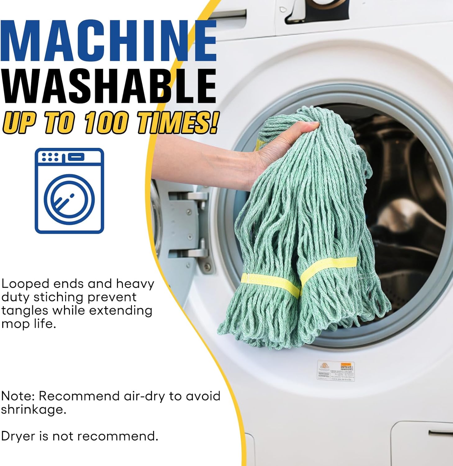 - Washable and Long-Lasting: Commercial mop heads are launderable for extended long-term usage. Long-lasting fibers allow the mop head to be washed many times giving it a longer service life. This washable mop head is launderable up to 100 times! NOTE: Do not use dryer after laundering to avoid shrinkage and loosen string, air-drying is recommended.