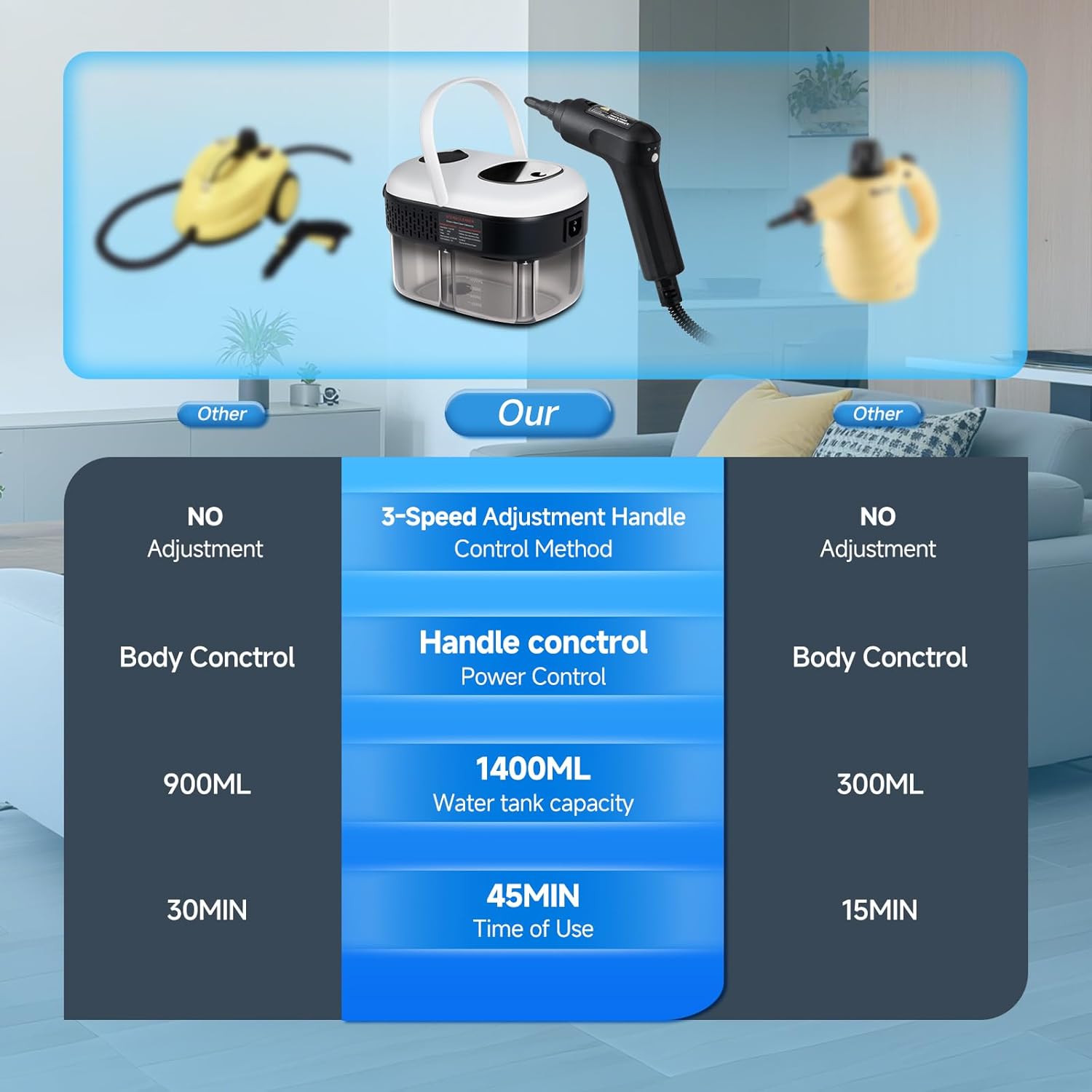 - Steam Cleaner Design: This home steam cleaner features a 1400ML high-capacity tank (45 mins runtime) with top-flip filling for splash-free refills and bottom drainage for easy water disposal. The 78.74 inch extended hose effortlessly reaches ceilings, shower stalls, and under furniture—50% longer than standard models. Paired with anti-leak seals and ergonomic handles, it delivers uninterrupted deep cleaning from floors to high walls without refill hassles.